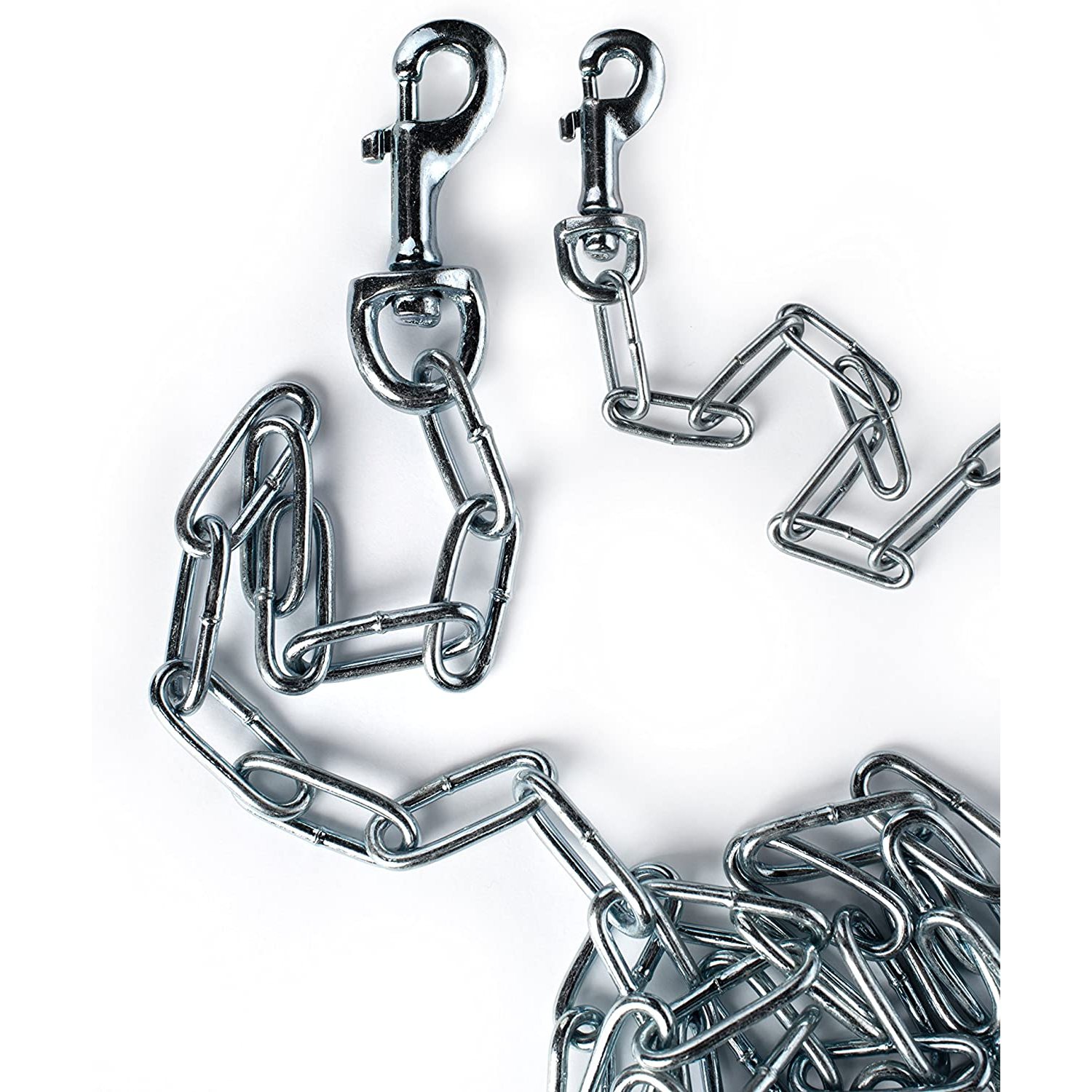 Prevue Pet Products heavy-duty 20Æ tie-out chain 2117 is designed for dogs up to 150 lbs. Zinc plated welded oval links are strong, ensuring your dog stays safe and secure. Premium quality die-cast iron swivel bolt snaps at both ends connect easily and prevent tangling. Heavy duty tie out chain is 20 foot long and 3.8 mm in diameter.